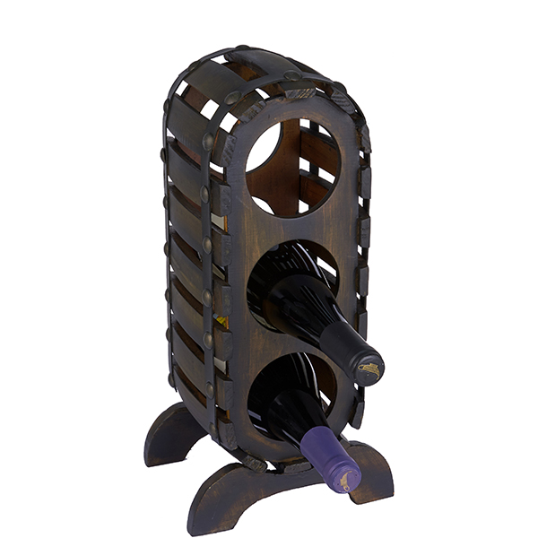 מעמד עץ לשלושה בקבוקי יין בצורת חבית עומדת