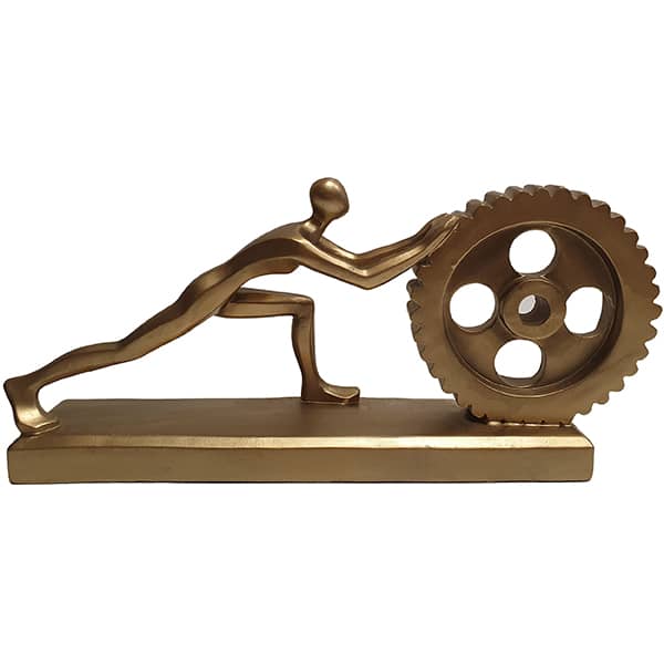פסל איש דוחף גלגל שיניים מוזהב